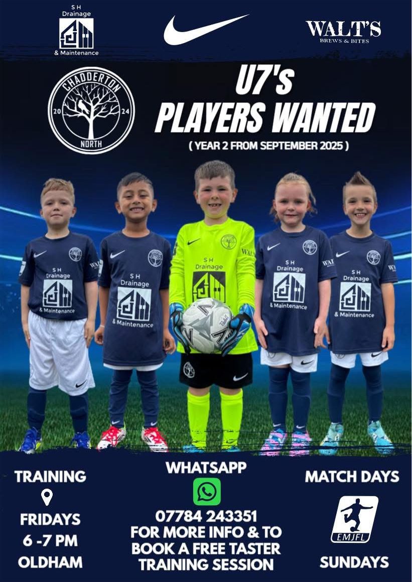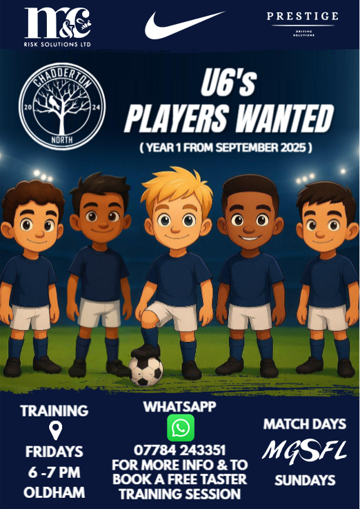 Chadderton North FC will be entering multiple teams into leagues for the upcoming season, these include U6's, U7's and U11's. All fixtures will be available via your clubs Whatsapp groups.